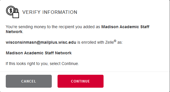 Thanks for considering using Zelle to pay for an annual Madison Academic Staff Network membership! This is one of two online ways we offer to pay for annual memberships, the other being Square. Square is based around Credit or Debit Cards, but Zelle is based around standard ACH transfers – which means it is free to use and has no transaction fees!
